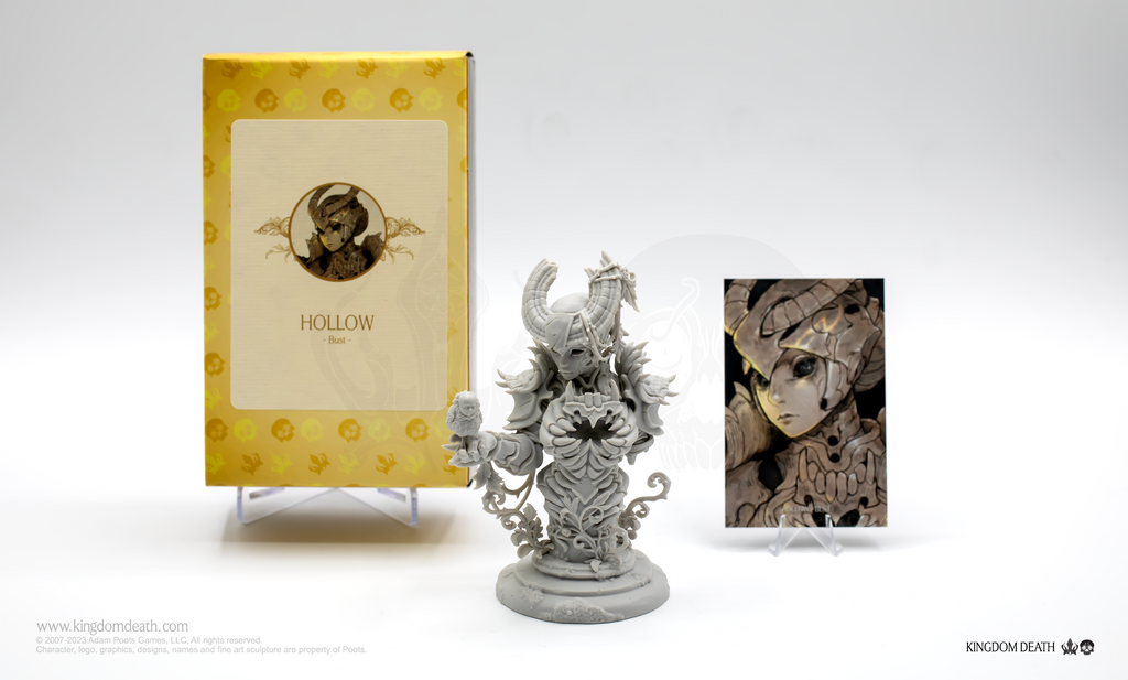 The Hollow Bust is packaged in a black and yellow crown and skull box :