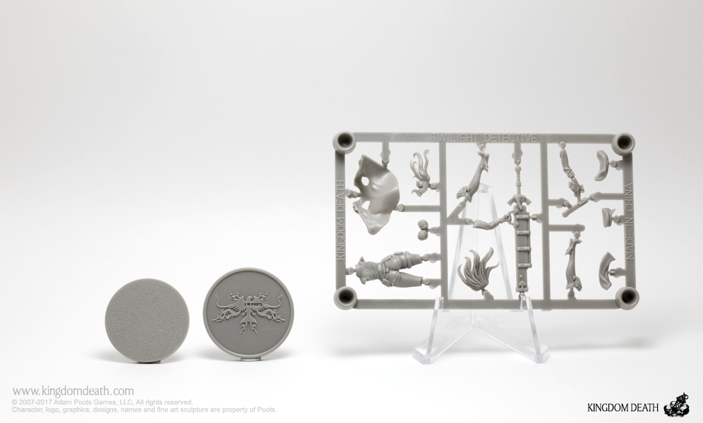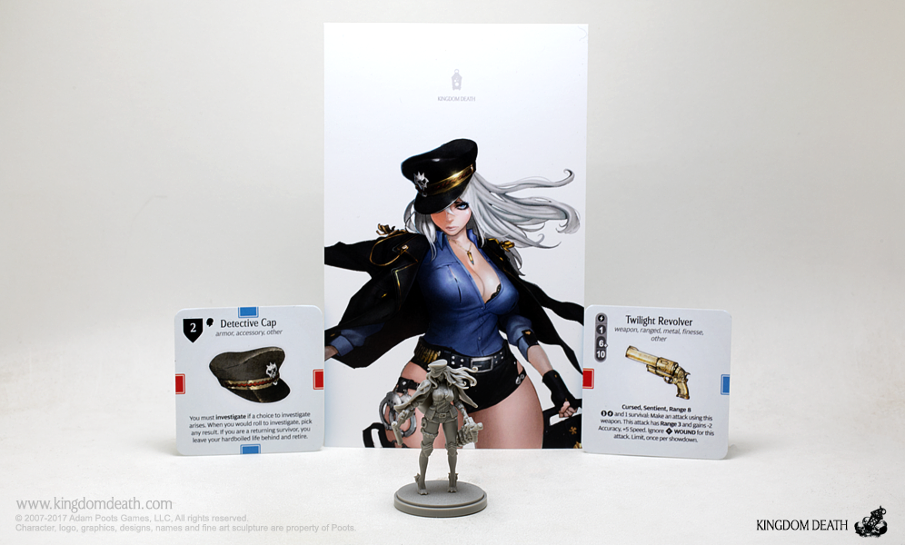 A hard-boiled take on the iconic Kingdom Death Pinup Twilight Knight, the Detective Twilight Knight comes equipped with the Twilight Revolver and Detective Cap promo gear cards, equipment perfect for tackling that one last case.
