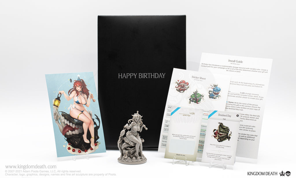 The Mystery Birthday Gift is packaged in a graphic box that includes: