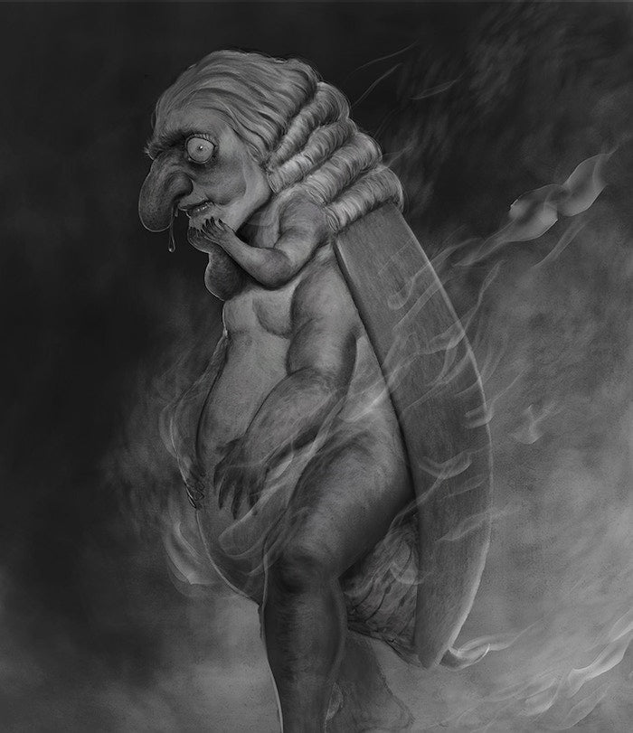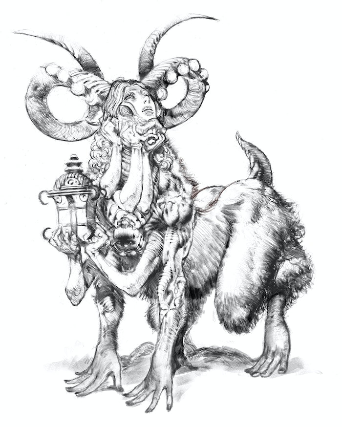 The nightmare ram is the living spawn of a parasitic plant. It subsists on the salt of creatures which it metabolizes to power the glowing bulbs that grow atop its tough horns and the large lantern organ on it carries outside its body. They are sensitive, lonesome creatures that carefully cultivate beautiful, hidden gardens containing the plants that produce them. They will often beat trespassers into a pulp and use them as salt-rich fertilizer. Like any fruit that has been picked, their life span is short.