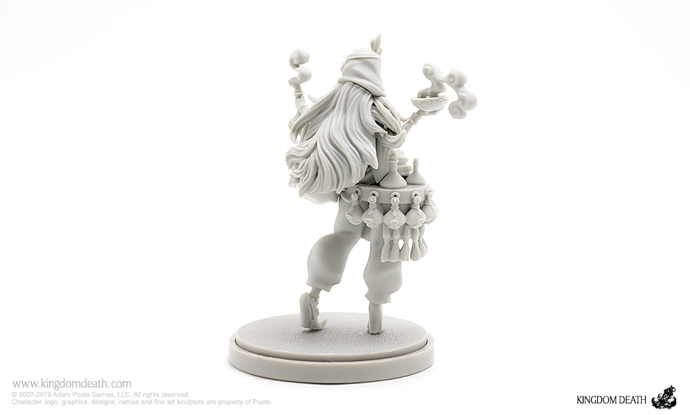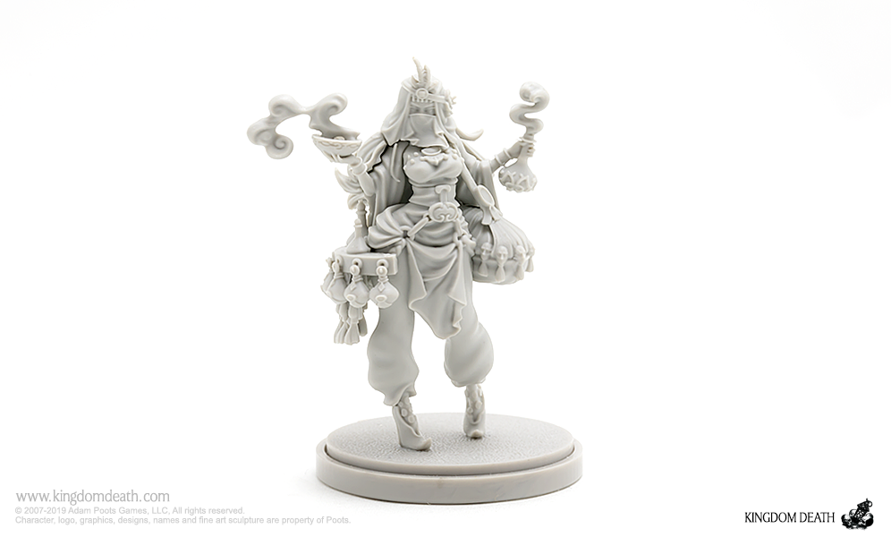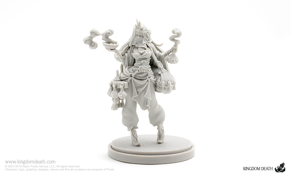 Born and raised in the riotous bustle of the Sunset Bazaar the Energy Potion Maker is a cunning operator, accepting treasures and rare objects in trade for her potions. Buyers of her brews use them to surmount impossible challenges with an extra boost of energy, specifically crafted for their task. Potion drinker that survive their trials find themselves profoundly exhausted, never knowing that the Energy Potion Maker slyly skims from their life force at the peak of their labors, amassing drops of fiery spirit into a potion reserved for her final challenge.