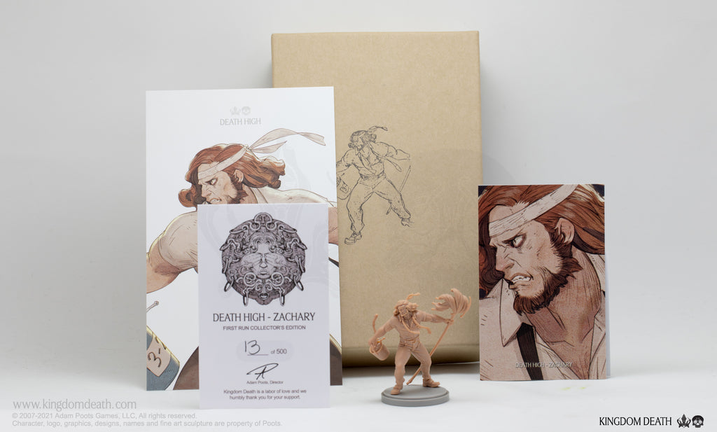 The Death High Zachary is packaged in a hand-stamped kraft box and includes: