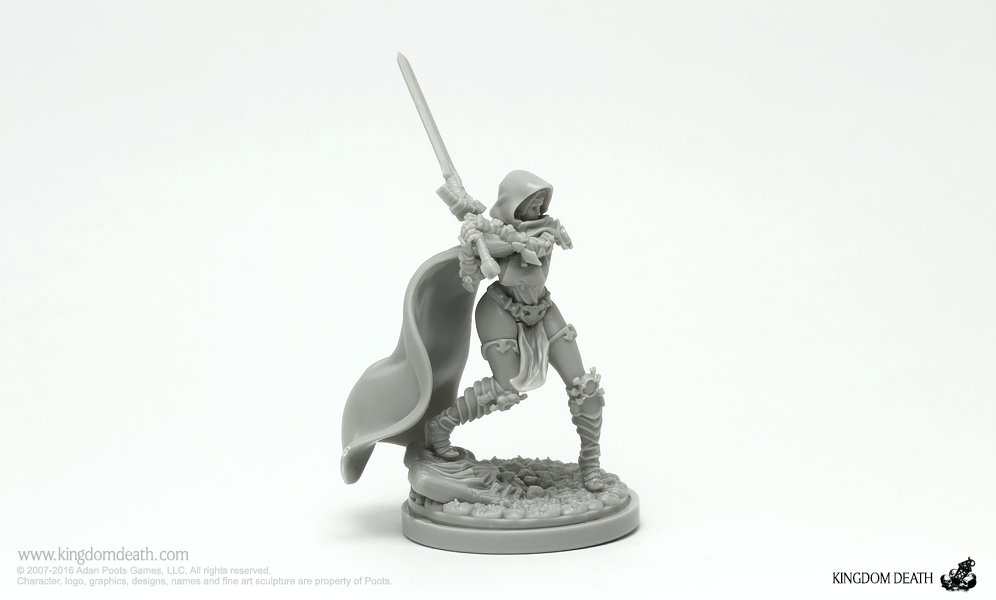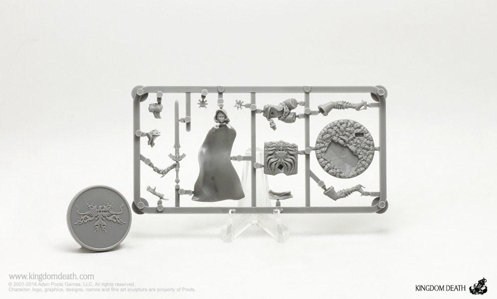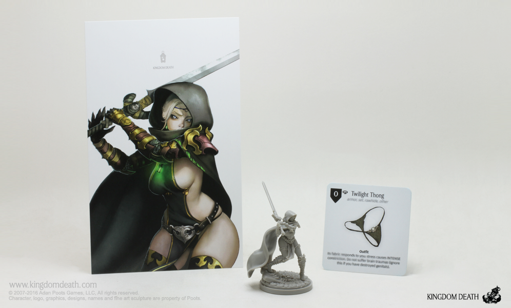 This pinup incarnation of the Order Knight is posed on a unique, scenic base insert. It includes a Twilight Thong promotional gear card to be used with Kingdom Death: Monster.
