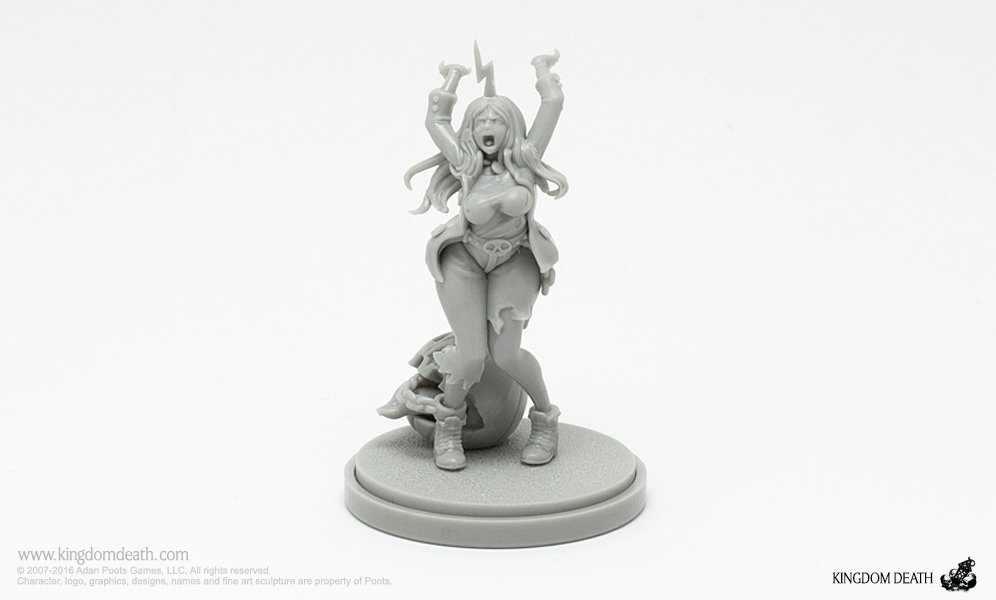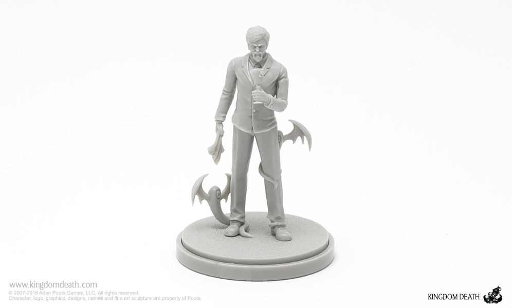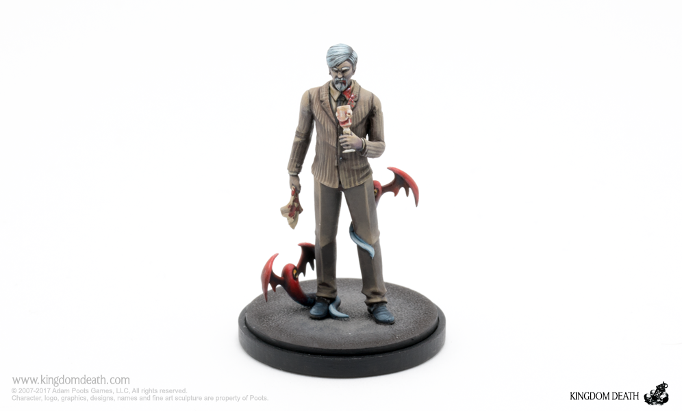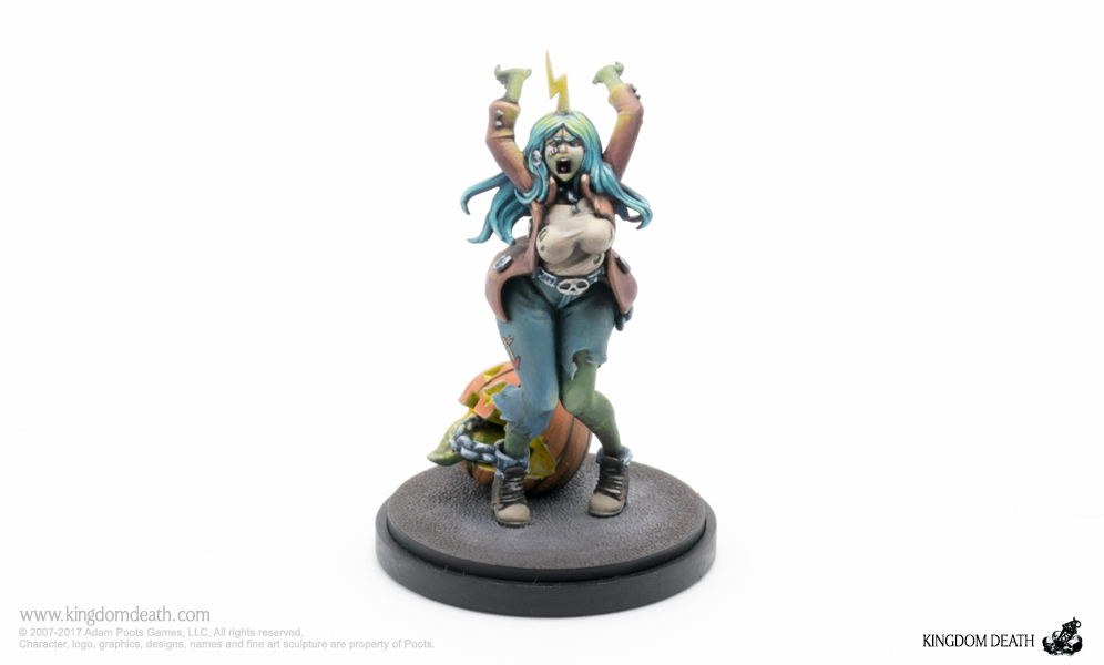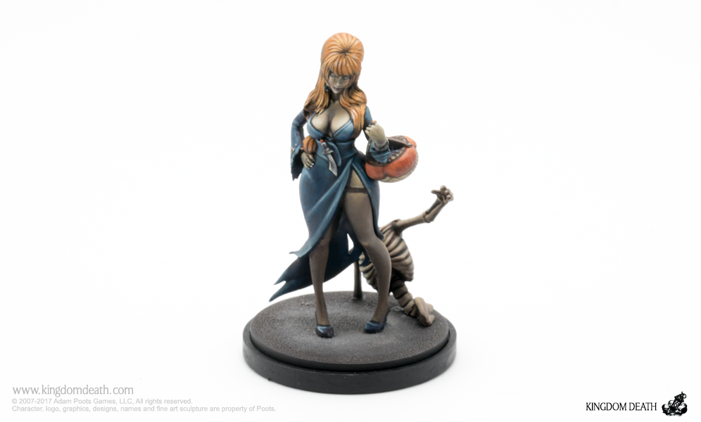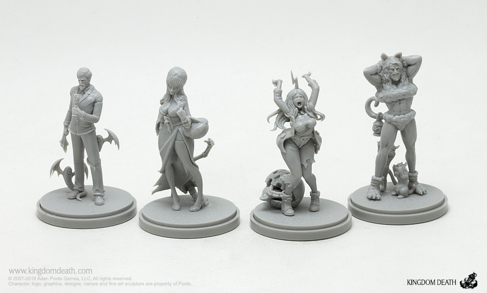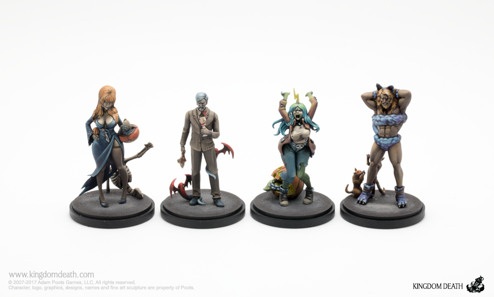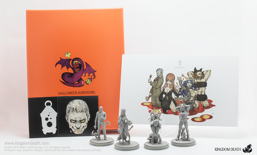 A Halloween collection of costumed starting survivors. Packaged in a festive orange box adorned with a winged beastie, this hard plastic collection of Halloween-themed Kingdom Death miniatures includes 1 sprue and extra treats: