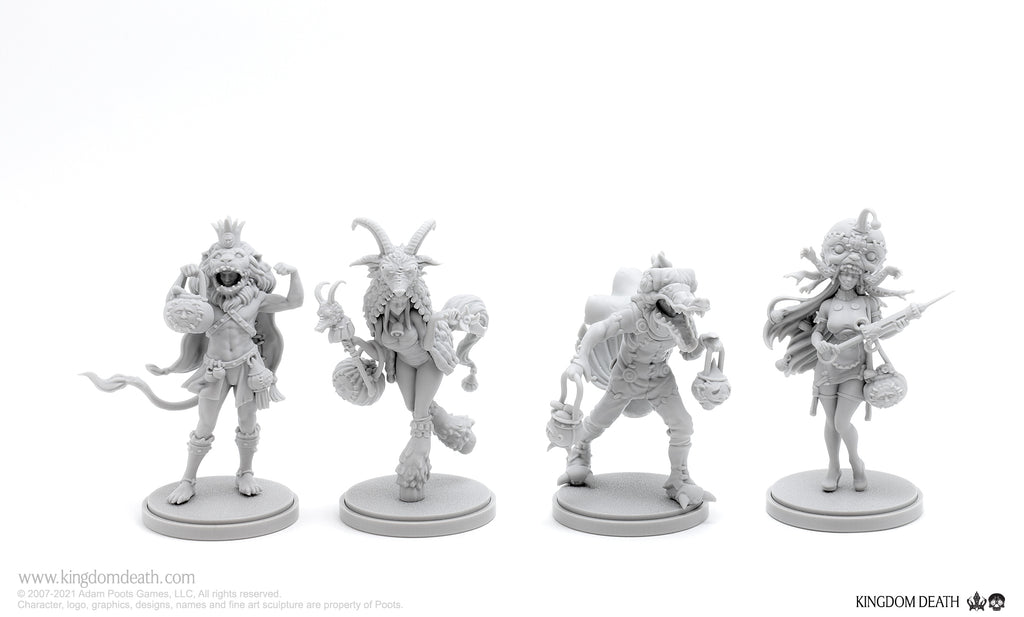A new group of survivors departs into the darkness to find out what awaits. Trick or treat! Packaged in a cheerfully illustrated box, this new hard plastic collection of costumed survivors includes 4 new thematic patterns and pattern gear cards.