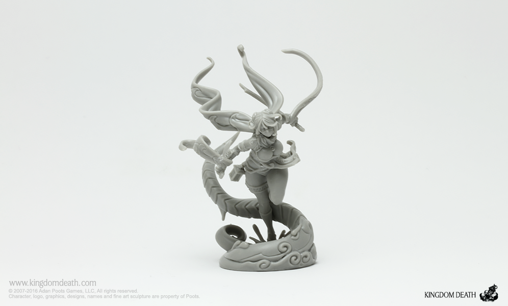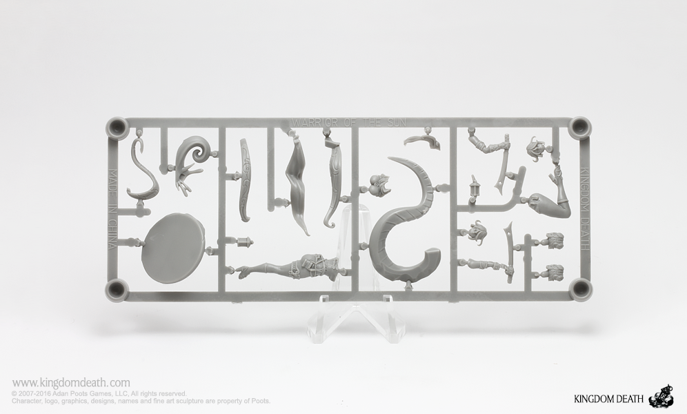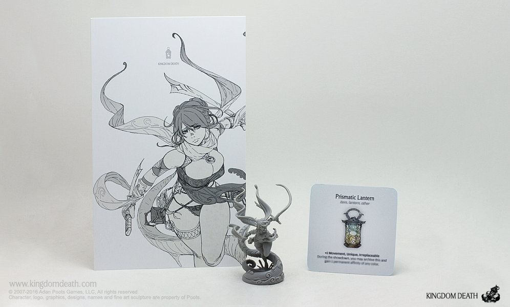 This pinup is a playful interpretation of the Warriors of the Sun. This hard plastic release includes the Prismatic Lantern promotional gear card for use in Kingdom Death: Monster.